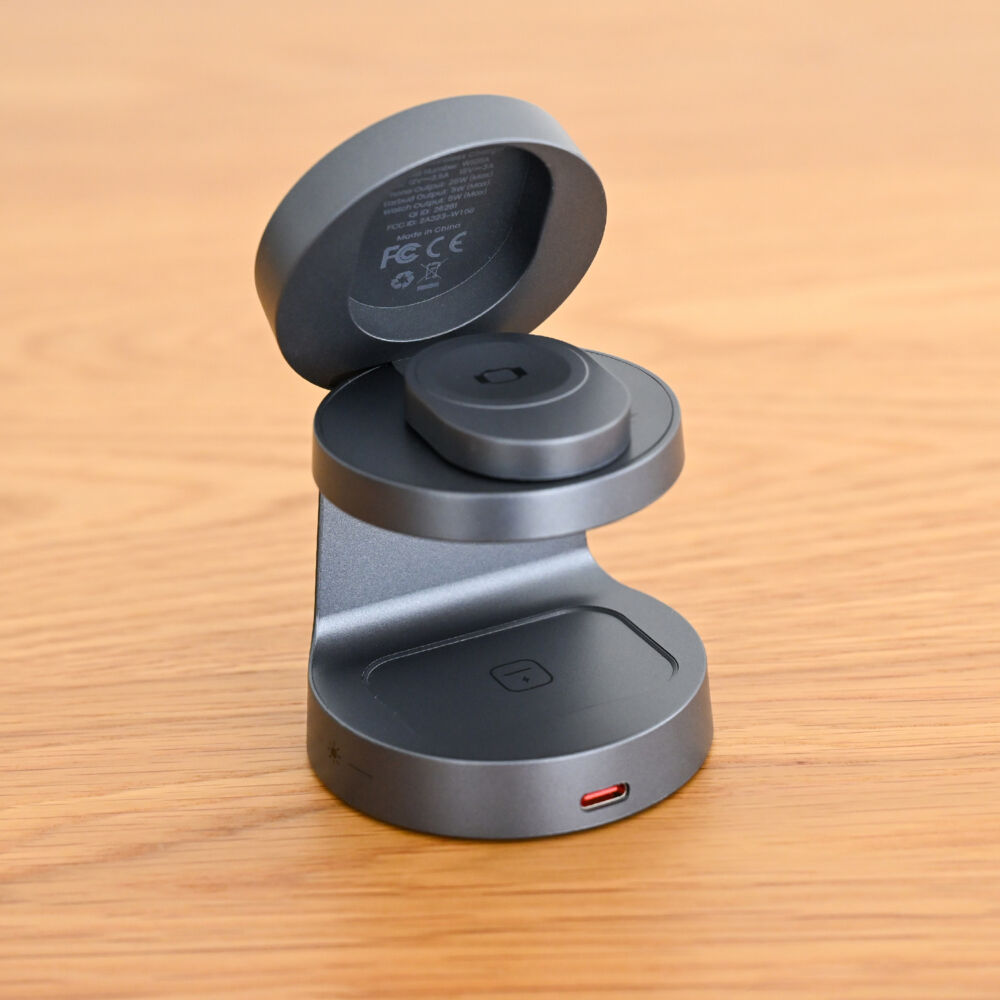 さらに、天面をチルトして引き出した磁気充電部では、Apple Watchも吊り下げ充電可能です。いずれも各最大5Wずつまで出る仕様。