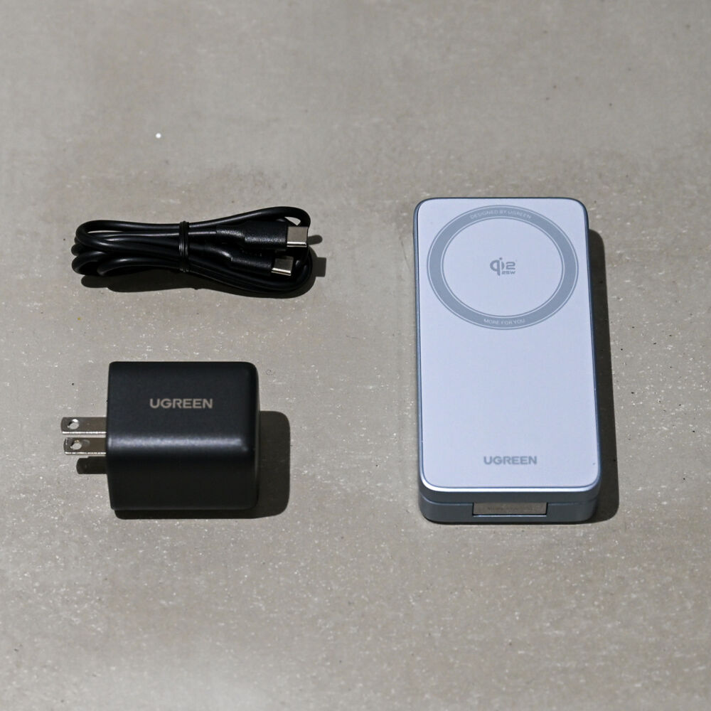 本体とケーブル、折りたたみプラグ式ではないものの、充電器もなんと付属しています。UGREEN MagFlow 2-in-1 マグネット式ワイヤレス充電器 25Wには付いてなかったので、かなり良心的。