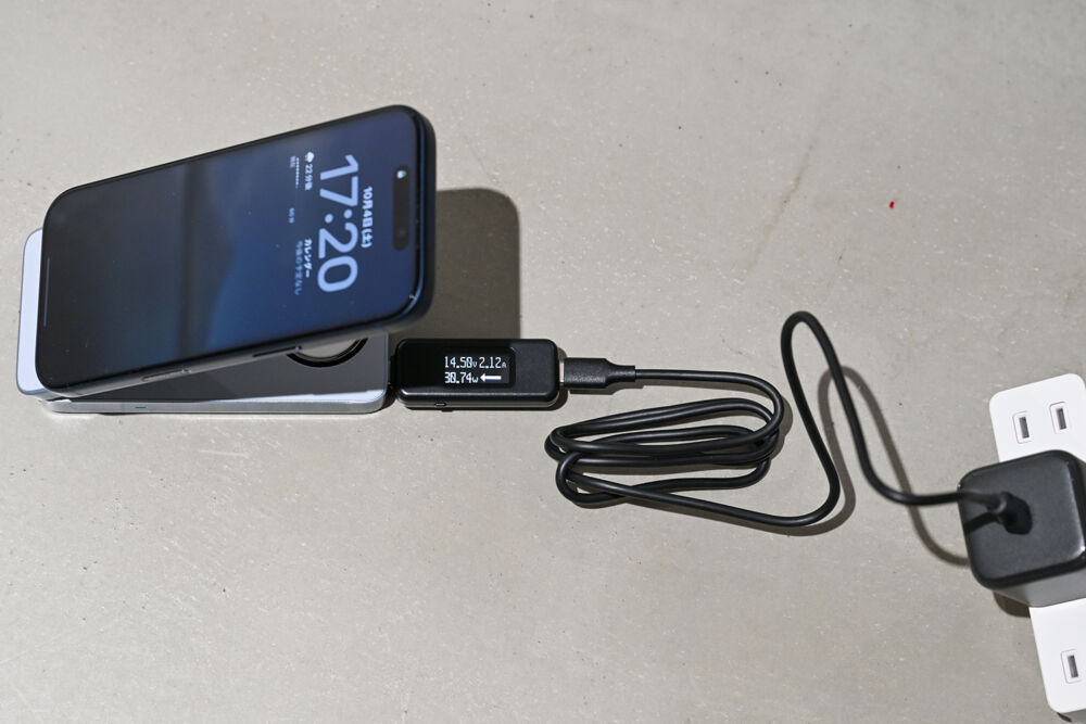 本機はQi2 25W対応。Qi2 25W対応スマホのiPhone 17 Proでワイヤレス充電したところ、なんと30W以上を記録しました。有線並みどころか、もはや有線同等の出力です。