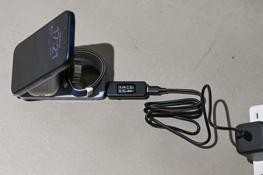 比較的コンパクトではあるものの、3つとも設置した際もそこまで窮屈になることなく同時充電可能です。各充電部の出力は当然制限されず、33W程度まで出ていました。