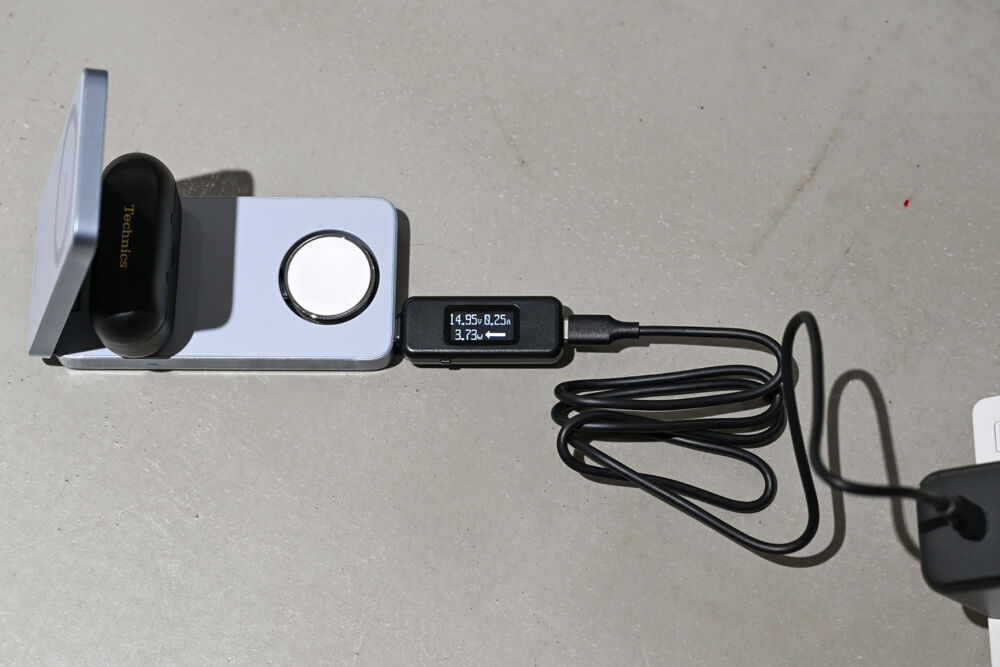 展開すると3-in-1充電器としてしっかり使え、スマホのQi2 25W対応ふくめ、各パッドがそれぞれの最大出力でワイヤレス充電可能です。