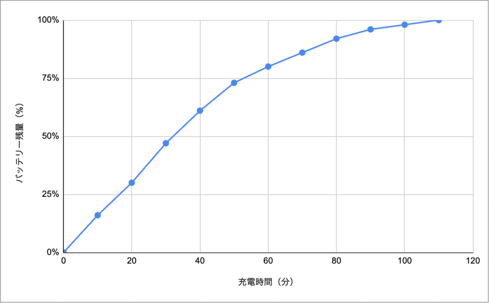 カラからフル充電までの時間も計測した結果、110分で満充電に達しました。充電開始30分で47%と、こちらもほぼ仕様どおりの速さです。