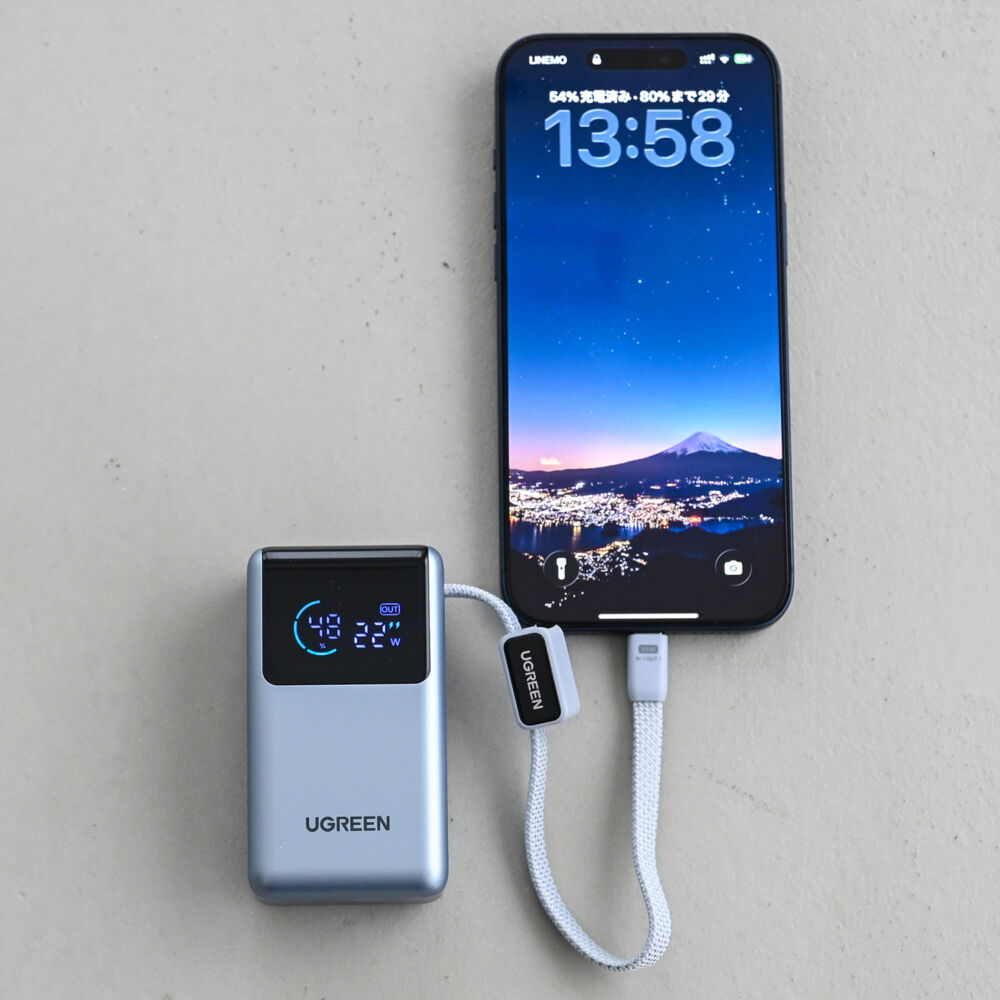 内蔵ケーブルとUSB-Cポートともに最大45W出力で、スマホの急速充電はもちろん、MacBook Airや一部のモバイルノートすらカバーできる高出力。