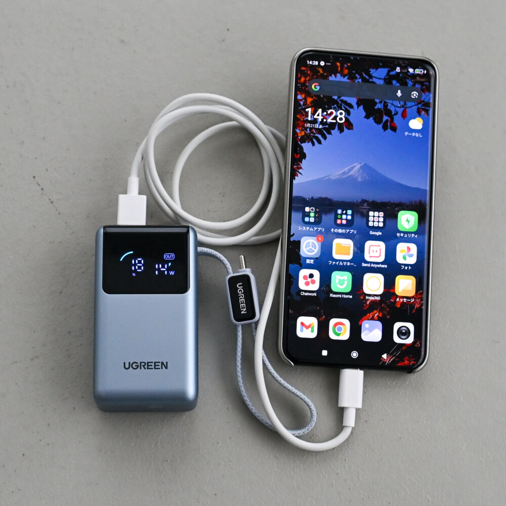 Xiaomiスマホへの出力はやや落ちるものの、巻き取り式ケーブルがいい人はAnker Nano Power Bank (10000mAh, 45W, 巻取り式 USB-Cケーブル)もおすすめです。