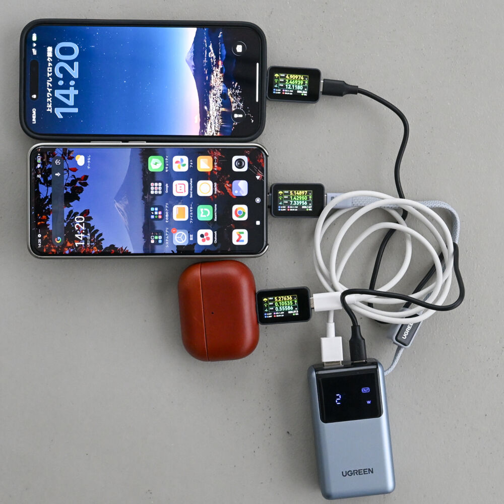 3台接続となるとなおさらなので、イヤホンやスマートウォッチを織り交ぜつつ、スマホが低出力充電になるのは覚悟のうえでつなぐしかないです。ただ実測では合計20W程度出てたので、これはうれしい誤算。