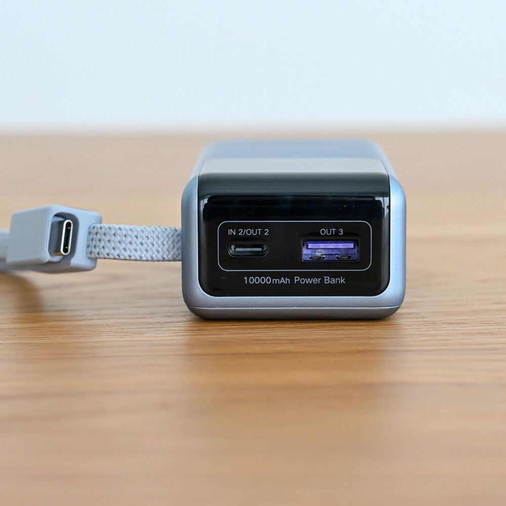 内蔵ケーブル以外にUSB-C + Aポートもそなえ、最大3台同時充電が可能と実用性も十分です。