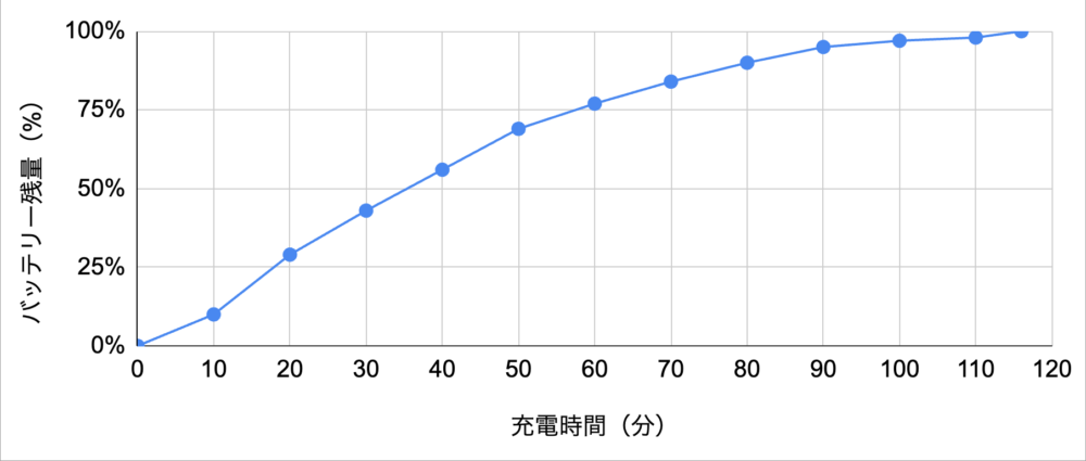 カラからフル充電までの時間も計測した結果、110分で満充電に達しました。充電開始30分で47%と、こちらもほぼ仕様どおりの速さです。