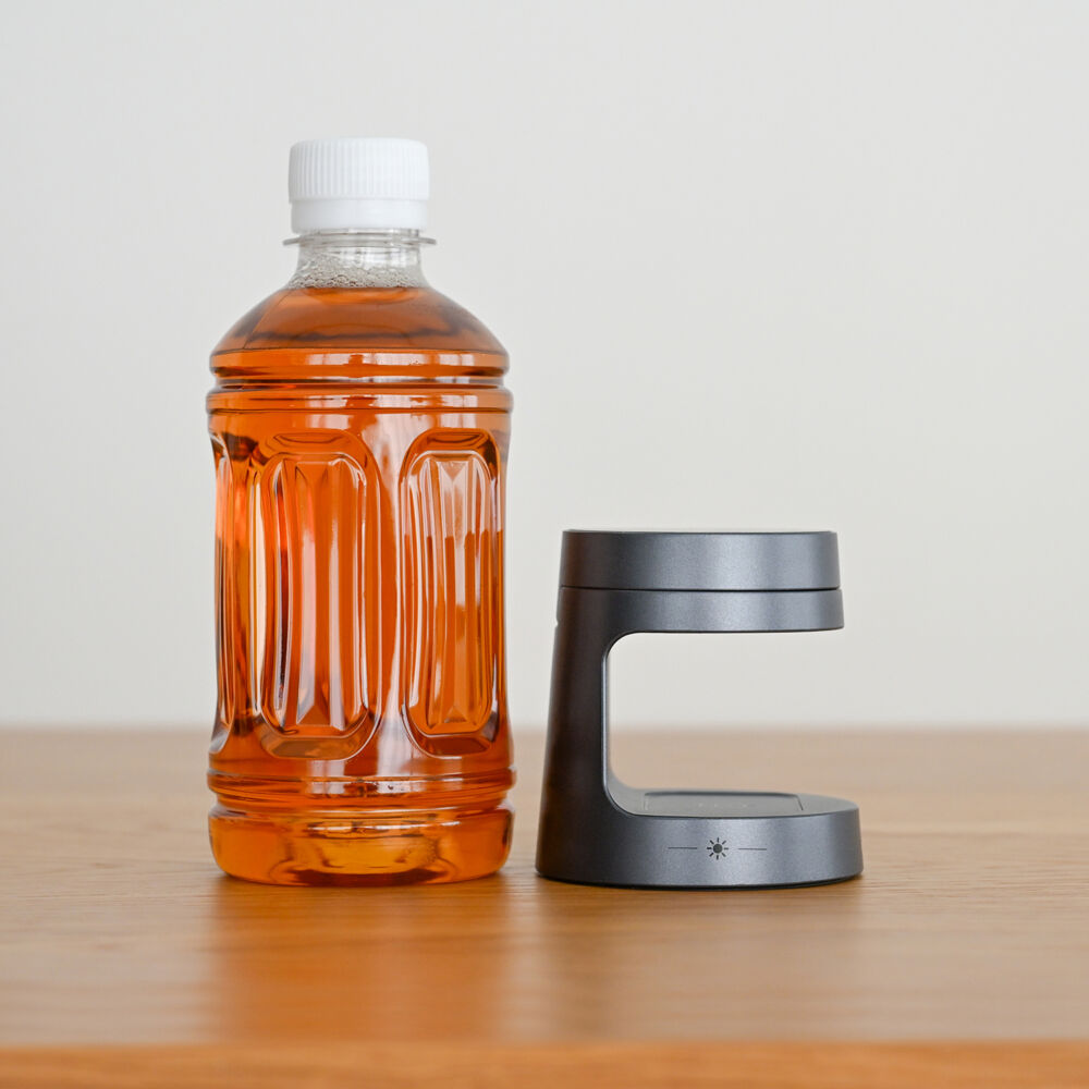 直径70ミリとかなりの省スペース設計で、200mlのミニペットボトルと並べても半分くらい。それなのに3台充電対応なのは驚き。