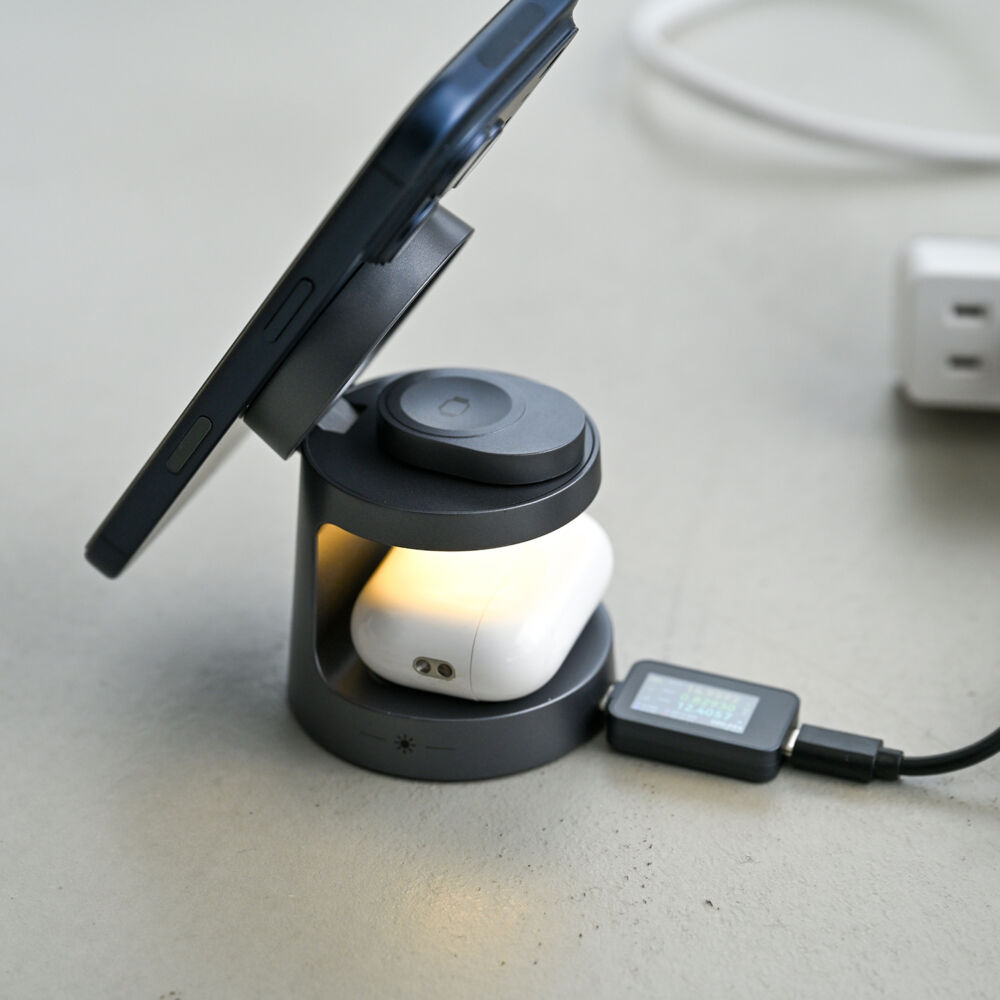 台座部のくぼみではイヤホン、天面の磁気充電パッドではApple Watchを吊り下げ充電でき、3台同時充電してもこの省スペースにおさまるのはありがたい。