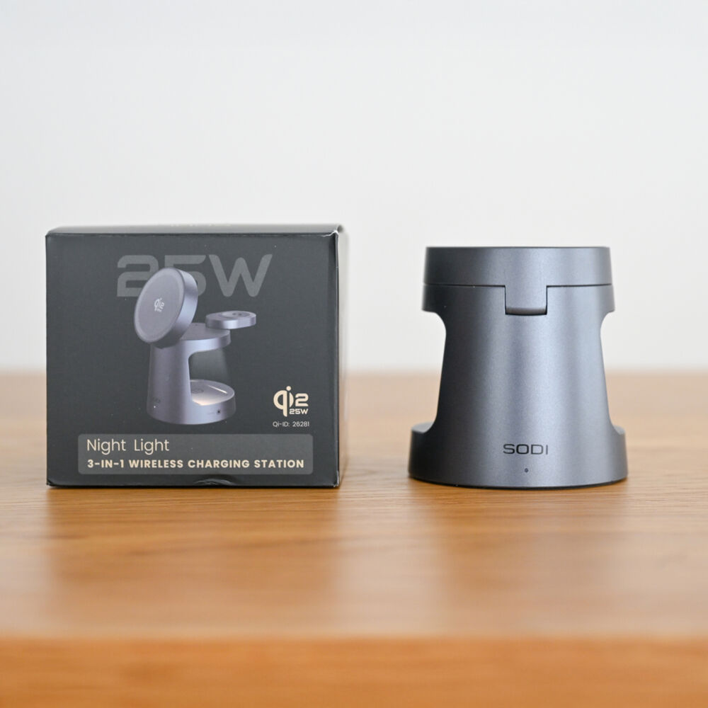 「SODI Qi2.2 25W ワイヤレス充電器 3 in 1」も、Qi2 25W対応スマホとQi対応イヤホン・Apple Watchを3台同時充電できるワイヤレス充電スタンドです。