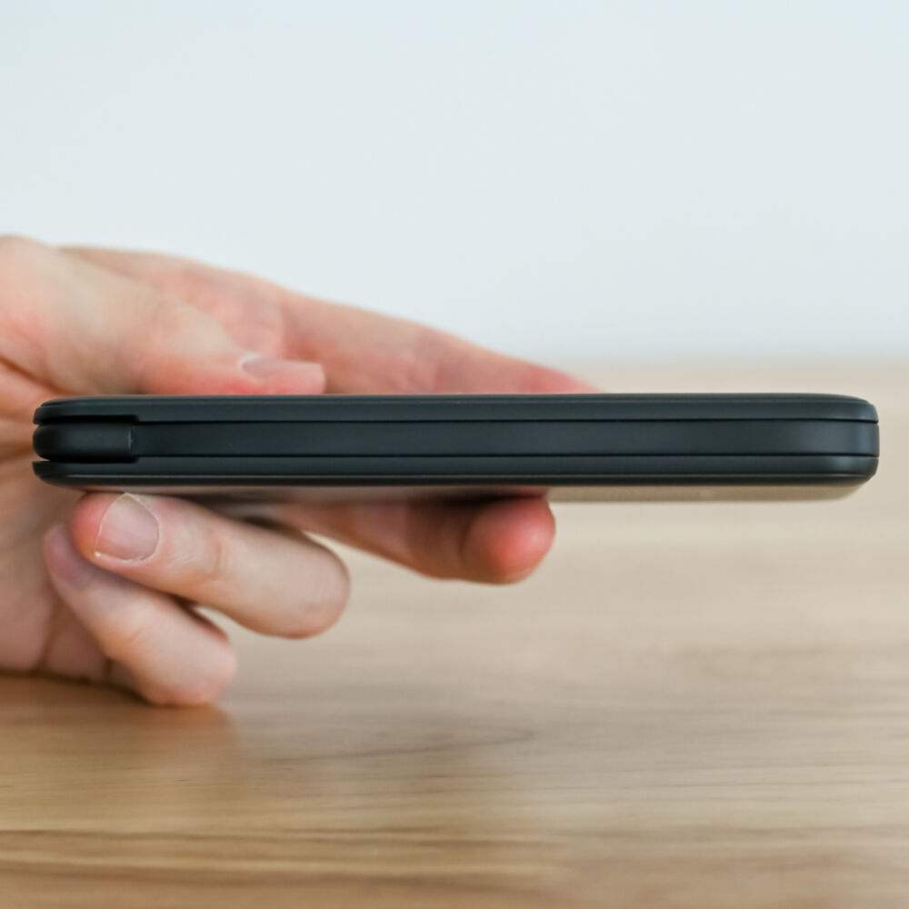同社の10000mAhクラスでは初の、ケーブルがピタッと収納されるモバ充で、ケーブル内蔵がいいけどすっきり持ち運びたい人に最適。