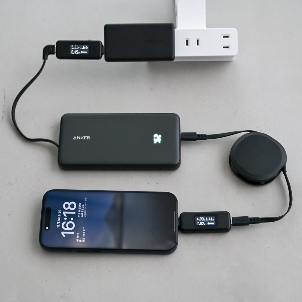 内蔵ケーブル/USB-Cポートともに最大22.5W出力に対応し、一般的なスマホなら十分な出力。L字で挿しやすいし、端子に負担もかかりにくいのがいいですね。