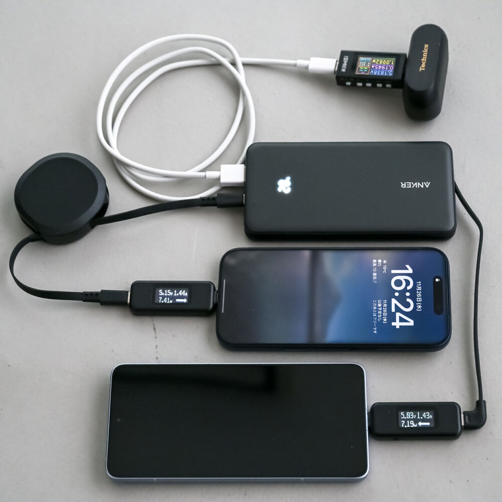 各スマホに分配される出力は10Wを切り、スマホ x 2 + イヤホンならなんとか同時充電できるものの、充電速度自体はゆるやかです。